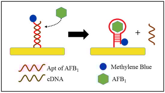 Schematic diagram of the AFB1 detection mechanism by a methylene blue-tagged aptasensor.