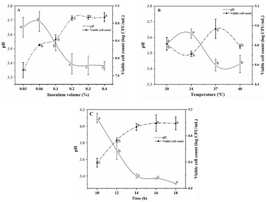 Changes in pH values and viable cell counts under different inoculation volumes (A) (0.03%, 0.06%, 0.10%, 0.20%, 0.30%, and 0.40% with separate trials at 37 °C and fermented for 14 h), fermentation temperatures (B) (30 °C, 34 °C, 37 °C, and 40 °C with separate trials with 0.30% inoculation volume and fermented for 14 h), and fermentation time periods (C) (10 h, 12 h, 14 h, 16 h, and 18 h with consecutive trials under different time points with 0.30% inoculation volume and fermented at 37 °C) with L. plantarum TUST-232. a,b,c Statistical analysis ANOVA at 95% confidence level, with different letters indicating a significant difference at p < 0.05.