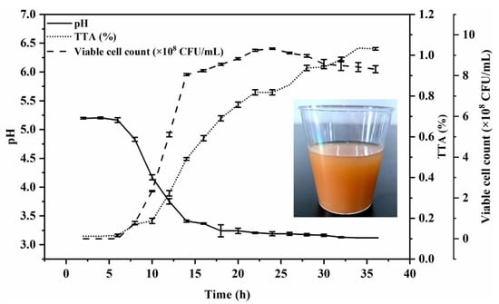 To determine the growth trend of the strain with a longer fermentation time, Figure 2 shows the growth curve and the change trend of pH values and TTA values from 0–36 h under the selected conditions of 0.3% inoculation volume and fermentation at 37 °C. L. plantarum TUST-232 entered the logarithmic growth phase at 6 h, and viable cell counts increased exponentially between 6 and 14 h, followed by a plateau and then a slow down after 24 h.