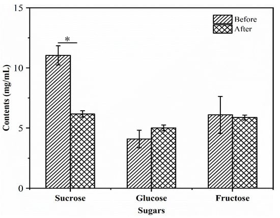 Changes in the content of sugars before and after fermentation of the R–B mixed juice with L. plantarum TUST-232. The contents of sugars, including sucrose, glucose, and fructose, were measured. The error bars indicate means ± SD (n = 3); the differences between groups were analyzed by a two-tailed paired Student’s t-test; * p < 0.05.