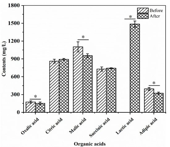 Changes in the content of organic acids before and after fermentation of the R–B mixed juice fermented with L. plantarum TUST-232. Organic acids, including oxalic acid, citric acid, malic acid, succinic acid, lactic acid, and adipic acid, were measured. The error bars indicate means ± SD (n = 3); the differences between groups were analyzed by a two-tailed paired Student’s t-test. * indicates significant differences at p < 0.05.