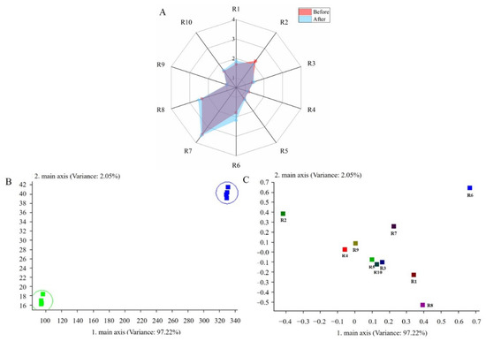 Radar plot (A), PCA score plot (B), and loading plot (C) of the aromatic compounds in the R–B mixed juice before and after fermentation detected by electronic nose.