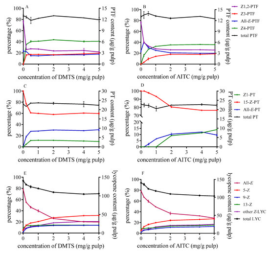 The changes in the ratio of each isomer and the content of three carotenoids in tomato pulp with different concentration of DMTS and AITC are shown in Figure 1. The proportion of Z-lycopene rose in tandem with an increasing number of catalysts. Newly formed cis configurations are mainly presented by 5-Z-lycopene, as it is more stable than other isomers. When DMTS was added to tomato pulp as catalyst, the ratio of total Z-isomers was higher than that of AITC at the same concentration, which indicated that the Z-isomerization efficiency of DMTS was stronger than that of AITC. For example, the proportion of all-E-lycopene was dropped to 20% with DMTS at a concentration of 5 mg/g (as illustrated in Figure 1E), which was less than that of AITC (29%) (as illustrated in Figure 1F) under the same condition. Moreover, the proportion of each lycopene isomer was barely changed when the concentration exceeded 2 mg/g tomato pulp. Meanwhile, the content of total lycopene decreased as the quantity of catalysts increased. The total lycopene content in the raw tomato pulp was 142.4 µg/g and decreased to 105.8 µg/g and 107.8 µg/g when 5mg/g tomato pulp DMTS and AITC added, respectively.