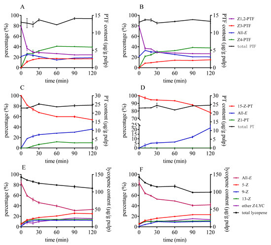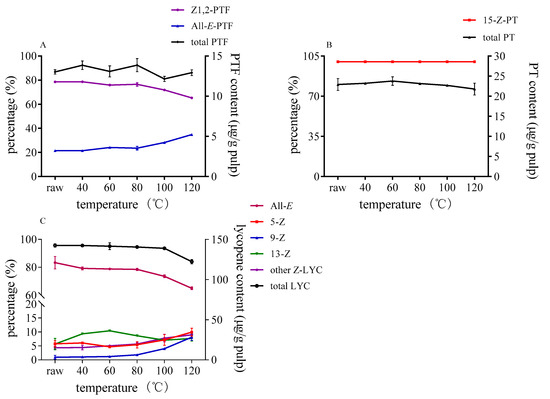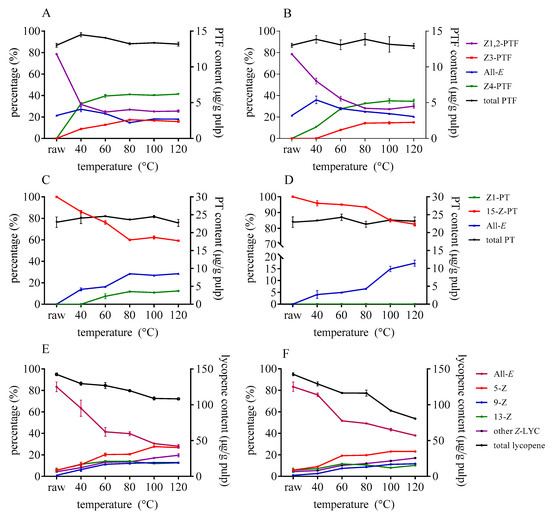 The isomerization of lycopene could happen even at a lower temperature of about 40 °C when catalysts are added (as illustrated in Figure 3). As the temperature rose, the ratio of Z-lycopene increased significantly. Besides, the decomposition of total lycopene progressed as the Z-isomerization occurred. Similarly, the isomerization efficiency of DMTS was stronger than that of AITC under the same temperature. Different from lycopene, there was no significant degradation of PTF and PT as the temperature rose, which indicate that the isomers of PTF and PT remain stable within 120 °C. Once the catalysts were added, the content of Z1,2-PTF decreased, while Z3- and Z4-PTF accumulated when temperature increased. Z1,2-PTF was still the predominant isomer at lower temperature; however, the ratio of Z4-PTF gradually increased as the temperature rose to 120 °C. The content of Z4-PTF took up about 40% of total PTF in the case of DATS after heating to 120 °C. As for PT, the content of 15-Z-PT significantly decreased and converted to all-E- and Z1-PT as the temperature rose. The higher the temperature was, the more Z1- and all-E-PT accumulated by DMTS (as illustrated in Figure 3C). In the case of AITC, Z1-PTF cannot be formed, even at a higher temperature when the concentration was 1 mg/g tomato pulp.