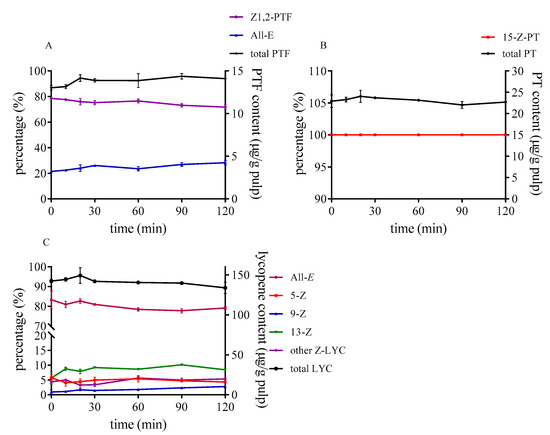 During heating tomato pulp at 80 °C from 0 to 120 min, the degradation and isomerization hardly occurred in these three carotenoids without sulfur-containing compounds (as illustrated in Figure 4). Only the proportion of 13-Z-lycopene slightly increased, which was probably because of its lower rotational barriers, as opposed to that of other Z-lycopene [38]. PTF and PT were stable within 120 min under 80 °C as well. Cooperstone et al. [25] also found that PTF and PT were unchanged when tomato sauce was processed at 100 °C for 180 min with fat.