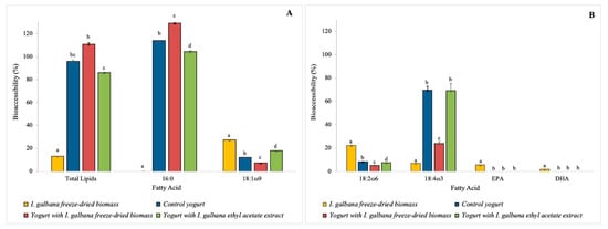 | I. galbana freeze-dried biomass | Initial | 36.8 ± 3.1 aA | 32.6 ± 1.6 aA | 14.8 ± 2.3 aA | 15.9 ± 0.9 aAB |