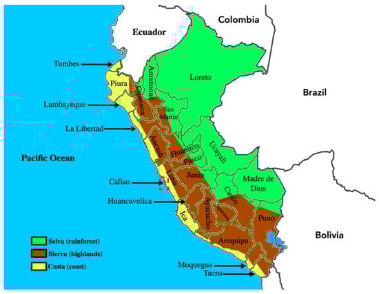 Compliance with international trade laws is crucial for Peruvian producers who desire to export their crop output. Given that the US and countries in the European Union (EU) are major importers of Peruvian foods, the latter have to meet the respective food-safety requirements. The Food Safety Modernization Act (FSMA), the major food-safety standards in the US, plays a key role in import acceptance in the ports of entry. One FSMA rule in the Foreign Supplier Verification Program requires importers to provide a phytosanitary certificate, issued by Peru’s SENASA, that verifies that the product meets all the US food-safety standards [19,20]. A similar rigorous process occurs when exporting to the EU, as the legislation requires that the exporter be certified by SENASA [21]. The ability to comply with export regulations has made the food sector more vibrant, and there has been an improvement in agricultural education and infrastructure primarily [22]. However, this is an ongoing effort to lower the discrepancies in access to these benefits across all the geographical regions of Peru (refer to Figure 1 for a map of Peru); from the Costa (coast) with more mechanized agriculture, to the more small-scale agriculture that predominates in both the Selva (Amazon rainforest) and the Sierra (highlands) [23].