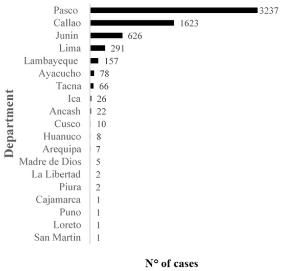 Number of acute heavy-metal-related intoxications in Peru in 2018. Data adapted from a report by the Ministry of Health (MINSA, 2019b).