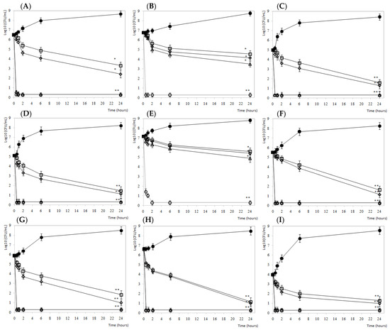Microbial viability evolution of (A) L. monocytogenes CECT 4032; (B) L. monocytogenes CECT 5366, (C) L. monocytogenes DMC 1-23, (D) L. monocytogenes DMC 3-17, (E) L. innocua CECT 4030, (F) L. innocua DMC 4, (G) L. innocua DMC 5-1, (H) L. innocua DMC 6-2, and (I) L. innocua DMC 7-3 in the presence of citrus extract. Concentrations tested for each strain: ● 0 ppm (negative control), □ 0.5%, ♦ 1%, Δ 5%, and ○ 10% of citrus extract. Values are means with SD in bars. * p < 0.05; ** p < 0.001 respect to control.
