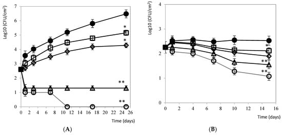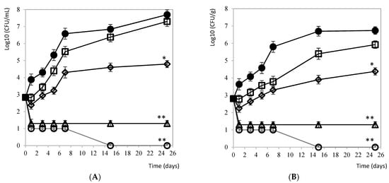 (A) Evolution of L. monocytogenes in (A) mozzarella cheese and (B) brine during 25 days of conservation at 4 °C: ● 0 ppm (negative control), □ 0.5%, ♦ 1%, Δ 5%, and ○ 10% of citrus extract. Values are means with SD in bars. * p < 0.05; ** p < 0.001 with respect to the control.