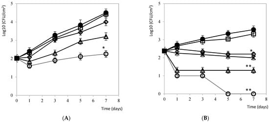 (A) Evolution of L. monocytogenes on the surface of salmon during 7 days of conservation at 4 °C: ● 0 ppm (negative control), □ 0.5%, ♦ 1%, Δ 5% y, and ○ 10% of citrus extract. Values are means with SD in bars. * p < 0.05 with respect to the control. (B) Evolution of L. monocytogenes on the surface of lettuce during 7 days of conservation at 4 °C: ● 0 ppm (negative control), □ 0.5%, ♦ 1%, Δ 5% y, and ○ 10% of citrus extract; X 150 mg/L of sodium hypochlorite. Values are means with SD in bars. * p < 0.01; ** p < 0.001 with respect to the control.