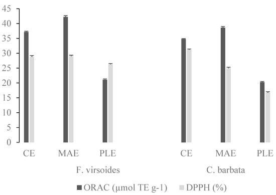 Antioxidant capacity of F. virsoides and C. barbata polysaccharides, obtained by conventional extraction (CE), microwave assisted extraction (MAE), and pressurized liquid extraction (PLE), determined by oxygen radical absorbance capacity (ORAC) and DPPH assays.