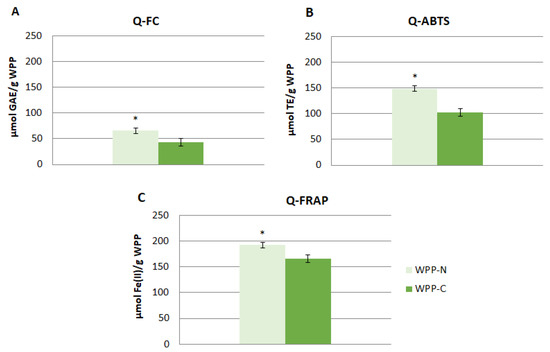 The results of the total antioxidant capacity (TAC) of both WPP also highlighted the differences between the products (Figure 1). The Q-FC results showed higher values in WPP-N than in WPP-C, agreeing with the results of the individual phenolic compounds. Similarly, the Q-ABTS and Q-FRAP values were higher in WPP-N, probably due to its higher content of polyphenol compounds [32,33].