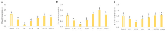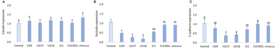 Caco-2 cell junction protein expression after L. monocytogenes invasion. Values represent the relative gene expression of claudin (A), occludin (B), and E-cadherin (C) of the control cells (cells uninfected with L. monocytogenes) and cells infected with ILSI9, ILSI17, and ILSI18 (clinical L. monocytogenes strains) and S11 and E10.652 (food L. monocytogenes strains) and L. innocua. The results are presented as the means ± SD (n = 4). Different letters on each column indicate significant differences (ANOVA, p < 0.05) among the mean values.