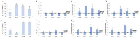 Effect of WPP on the virulence of ILSI9, ILSI17 ILSI18, and S11 L. monocytogenes strains on SW480 cells. (A) In vitro invasion capacity of L. monocytogenes strains treated with WPP-N, expressed as % of inhibition with respect to each control (invasion capacity of each Listeria strain grown in the absence of WPP-N). (B–D) Relative values of the gene expression of claudin (B), occludin (C), and E-cadherin (E) with respect to the corresponding controls (cells infected with each L. monocytogenes strain grown in the absence of WPP-N). (E) In vitro invasion capacity of the Listeria strains treated with WPP-C, expressed as % of inhibition with respect to each control (invasion capacity of each Listeria strain grown in the absence of WPP-C). (F–H) Relative values of the gene expression of claudin (E), occludin (F), and E-cadherin (G) with respect to the corresponding control (cells infected with each L. monocytogenes strain grown in the absence of WPP-C). Gene expression was assessed by real-time PCR. The results are presented as the means ± SD (n = 4). Columns marked with * indicate gene expression values statically different than the respective control (Student’s t-test, p < 0.05). Letters on each column indicate significant differences among the values for each Listeria strain (p < 0.05).