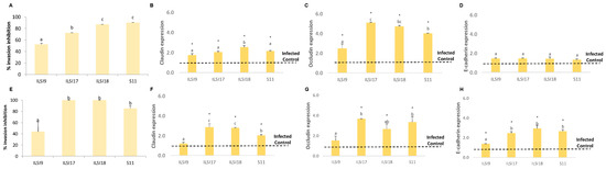 Effect of WPP on the virulence of ILSI9, ILSI17 ILSI18, and S11 L. monocytogenes strains on Caco-2 cells. (A) In vitro invasion capacity of the L. monocytogenes strains treated with WPP-N, expressed as % of inhibition with respect to each control (invasion capacity of each Listeria strain grown in the absence of WPP-N). (B–D) Relative values of the gene expression of claudin (B), occludin (C), and E-cadherin (E) with respect to the corresponding control (cells infected with each L. monocytogenes strain grown in the absence of WPP-N). (E) In vitro invasion capacity of the Listeria strains treated with WPP-C, expressed as % of inhibition with respect to each control (invasion capacity of each Listeria strain grown in the absence of WPP-C). (F–H) Relative values of the gene expression of claudin (E), occludin (F), and E-cadherin (G) with respect to the corresponding control (cells infected with each L. monocytogenes strain grown in the absence of WPP-C). Gene expression was assessed by real-time PCR. Results are presented as the means ± SD (n = 4). Columns marked with * indicate gene expression values statically different than the respective control (Student’s t-test, p < 0.05). Letters on each column indicate significant differences among values for each Listeria strain (ANOVA, p < 0.05).