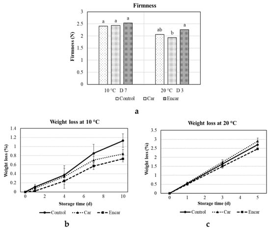 Effects of pectin-sodium alginate microencapsulated carvacrol (Encar) and non-encapsulated carvacrol (Car) on firmness (a) and weight loss (b,c) of fresh blueberries at 10 °C for up to 10 days, and 20 °C for up to 5 days. Bars with different letters within a storage temperature indicate significant differences using the Student’s t test (p < 0.05, n = 20).