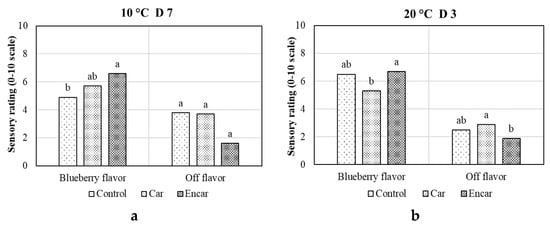 Effects of pectin-sodium alginate microencapsulated carvacrol (Encar) and non-encapsulated carvacrol (Car) on sensory properties of fresh blueberries after 7 days storage at 10 °C (a), and 3 days storage at 20 °C (b). Bars with different letters indicate significant differences using the Student’s t test (p < 0.05, n = 10).