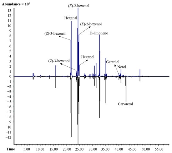 The abundant volatile compounds in blueberries were (Z)-3-hexenal, hexanal, (E)-2-hexenal, (E)-2-hexenol, (Z)-3-hexenol, hexanol, D-limonene, geraniol, and nerol (Figure 4), similar to a previous report [37]. Residual carvacrol in the treated blueberries was 227.9 mg kg−1 after 7 days of storage at 10 °C in the non-encapsulated carvacrol treatment, and 5.17 mg kg−1 in the microencapsulated carvacrol treatment (Figure 4). Carvacrol flavor has been described as a spicy, warm odor, and ‘thymol-like’ [38], and the average odor detection threshold is 30.97 mg kg−1 in sunflower oil [39]. Based on this published data, and considering carvacrol in our study was in a hydrophobic medium, the estimated odor activity value (OAV, volatile concentration/the odor detection threshold) in non-encapsulated carvacrol treatment was higher than 7, explaining the off-flavor perceived by panelists (Figure 3), and described as a spicy or medicinal off-flavor. The OAV in encapsulated carvacrol treatment was less than 1, which explains the lack of off-flavor in these fruit.