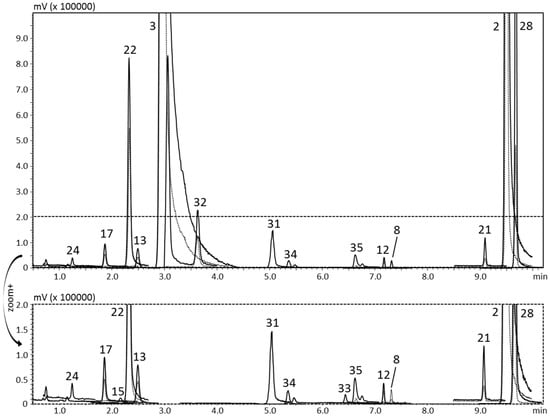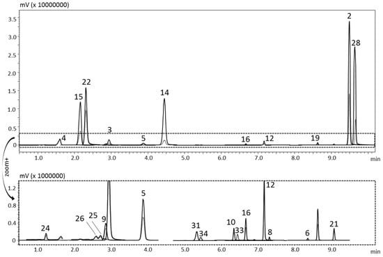 Figure 1 and Figure 2 show the qualitative profiles of two beverage samples, the home-made limoncello and the bergamot juice, respectively. The enlargement of the figure shows the components contained in a low amount, which were quantitatively determined through the sensitivity of this technique.