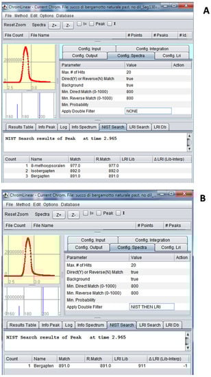 The full scan acquisition mode was used to verify potential co-elutions with the target compounds during the validation process. Table 1 reports the MRM transitions applied for the MS acquisition and the inter-sample LRI average for all the analytes in comparison with the tabulated values. The LRI system was applied for the unambiguous identification of target compounds as a library filter. A maximum difference of four units was obtained for all the compounds, thus, pointing out a satisfactory reproducibility of the LRI approach. For the first time, a novel software, ChromLinear, was applied to MS/MS analyses and the identification was automatically performed by match with MS/MS libraries in combination with the LRI database. As an example, Figure 3A shows the spectral similarity search results obtained for peak three (bergapten), pointing out that a list of three candidates was obtained, due to the fact that three isomers are characterized by quite identical fragmentation (same precursor and product ions, both quantifier and qualifier). The application of the additional LRI filter allows the univocal identification due to the automatic exclusion of two isomers characterized by a totally different retention index (Figure 3B). It is noteworthy that the use of the simple retention time could not represent a solution since at inter-laboratory levels or in different periods the retention time could be quite different, while it was already demonstrated that the LRI remains constant because of the normalization effect of the reference homologue series.