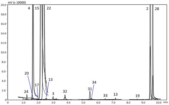 HPLC-MS/MS (MRM acquisition mode) chromatogram of the home-made limoncello. Quantifier ion, continuous line; qualifier ion, dotted line. For peak identification see Table 2.