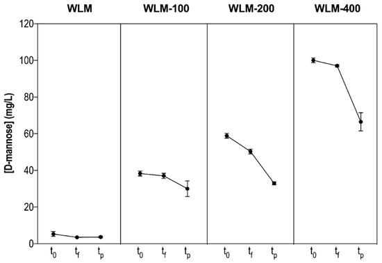 Mannoprotein concentration (mg of mannose eq./L) in wine-like medium (WLM) with mannoprotein extract addition throughout malolactic fermentation of O. oeni PSU-1. WLM-100, -200, and -400 represent the concentration (mg/L) of commercial mannoprotein extract added. t0, tf, and tp represent before O. oeni inoculation, at the end of MLF ((L-malic acid) < 0.1 g/L), and after MLF (3 days after completion of MLF), respectively.