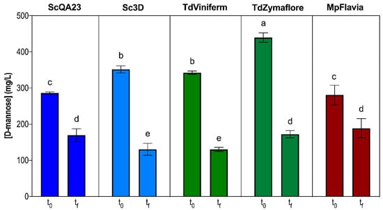 Mannoprotein concentration (mg of mannose eq./L) before and after malolactic fermentation in natural grape wines produced following different yeast inoculation strategies. Sc, Td, and Mp represent S. cerevisiae, T. delbrueckii, and M. pulcherrima, respectively, followed by the name of the commercial strain. t0 and tf represent before O. oeni inoculation and at the end of MLF ((L-malic acid) < 0.1 g/L). a–e Significantly different at p ≤ 0.05 according to a Tukey post-hoc comparison test.