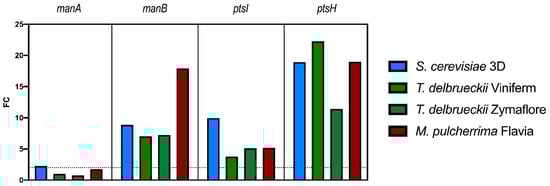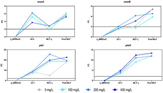 Evolution of relative expression as fold change (FC) of manA, manB, ptsI, and ptsH in WLM with different additions of mannoprotein extract, using the expression of the inoculum as the reference condition. FC = 2 is shown in the graph as the threshold for considering a gene to be upregulated.