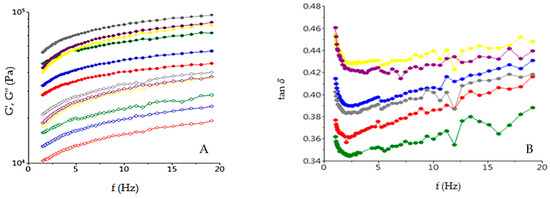 Evaluation with frequency of G’(open symbols), G”(solid symbols) (A) and tan δ (B) for the samples with different levels (-●-0%; -●-5%; -●-10%; -●-15%; -●-20%; -●-25%) of germinated bean flour additions.