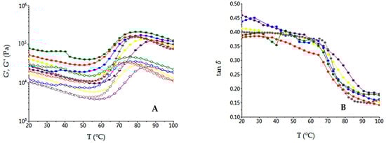 Evaluation with temperature of the G′ values (open symbols), G′′ (solid symbols) (A) and tan δ (B) for the samples with different levels (-●-0%; -●-5%; -●-10%; -●-15%; -●-20%; -●-25%) of germinated bean flour additions.
