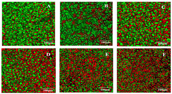 Microstructure taken by EFLM of the wheat dough with germinated bean flour (GBF) at different levels: 0% (A), 5% (B), 10% (C), 15% (D), 20% (E) and 25% (F). Red, protein; Green, starch granules.