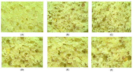 The microstructure of the breadcrumbs was characterized by pores that are formed due to the release of gas during the fermentation process of the dough and gas retention during fermentation and bread baking [56]. A bread of a good quality is characterized by small and uniform pores, which is desirable for a good porosity [57].