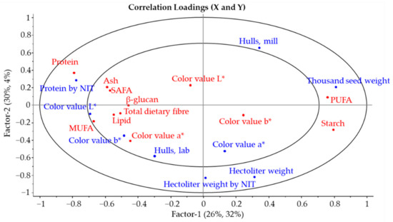 The partial least squares (PLS) regression of the properties of the native grains and heated oat flour confirmed the interactions between the different oat grain and heated flour parameters which were observed based on the Pearson correlation coefficients. The visual projection of factors 1 and 2 in PLS of the oat grain and heated oat flour parameters is shown in Figure 2, e.g., the thousand seed weight of the native grains grouped with the PUFA and starch values of heated oat flour. Furthermore, the lightness value (L*) of the oat grain grouped with several chemical components of the heated oat flours and the protein content of the oat grain determined by NIT are grouped with the protein content of the heated oat flour.