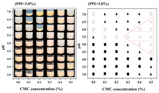Figure 1 shows the phase diagram of PPI-CMC mixed systems as affected by pH and CMC concentration. It can be seen that the individual PPI sample formed precipitate at pH ≤ 5.5, which might due to the protein syneresis and denaturation cause the aggregation of PPI. However, the mixed PPI-CMC solutions remained quite stable at a pH of 5.5. It might be the complexation of PPI and CMC provide more negative charges on the surface of the protein which inhibited the aggregation of the PPI at the acidic environment []. Nevertheless, it was worth noting that the addition of a certain amount of CMC led to obvious phase separation for the mixed systems prepared at neutral pHs (pH 6.0–7.0). This might due to the association of the same biopolymers inhibited the complexation of PPI and CMC, which caused the thermodynamic incompatibility between the negative charged PPI and CMC []. The inhibition of phase separation behavior at a higher level of polysaccharide in the neutral PPI-CMC mixed systems (pH 6.0, 0.4 and 0.5% CMC; pH 6.5 and 7.0, 0.5% CMC) could be associated with the increase in the bulk viscosity [].
