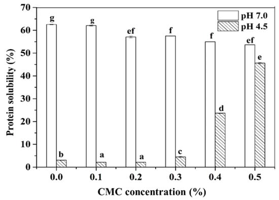 Protein solubility of 3.0% PPI solution as affected by CMC concentration at pH 7.0 and pH 4.5. Different letters represent a statistically significant difference at the same pH (p < 0.05).