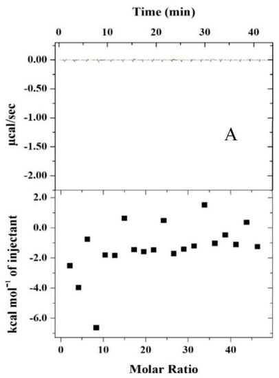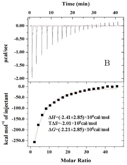 Thermodynamic parameters including enthalpy (ΔH) and change of entropy (TΔS) for the systems at pH 7.0 and 4.5 were calculated by iterative curve fitting of the binding isotherms. In the present state, “one independent binding site” model was used to fit the data since there weren’t two inflection points in the binding isotherm []. The Gibbs free energy change (ΔG) was calculated as follow: