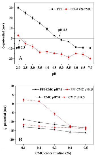The effects of pH on the ζ-potential of 3.0% PPI, 0.4% CMC are shown in Figure 4A. It revealed that the ζ-potential of the individual PPI solution went from negative (−9.5 mV) to positive (30 mV) as the pH decreased from 7.0 to 2.0, with a zero-charge point near pH 4.8. The CMC carried negative charges above pH 2.3 and showed no obvious change until the pH lower than 3.5.