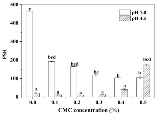 Effects of CMC concentration on the protein surface hydrophobicity (PSH) of PPI (3.0%) at pH 7.0 and pH 4.5 in the aqueous systems. Different letters indicate a statistically significant difference at the same pH (p < 0.05).
