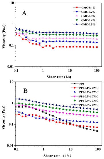 Moreover, it was clear that most of the n values for the individual CMC solutions were close to 1 (Table 1). However, PPI-CMC mixtures exhibited n values less than 1. It is known that the flow behavior n = 1 represents a Newtonian fluid and n < 1 means a pseudoplastic (shear-thinning) fluid []. Therefore, the PPI-CMC mixtures showed an obvious pseudoplastic behavior with shear-thinning flow behavior, indicating the destruction of network structure between biopolymers or inter-molecular bonds, and/or reorganization of biopolymer structures under shear []. Meanwhile, the n values of PPI-CMC mixed solutions were much lower than that of the CMC solutions within the same pH, indicating a shift to pseudoplastic behavior and again proved the existence of PPI-CMC interactions in these aqueous systems.