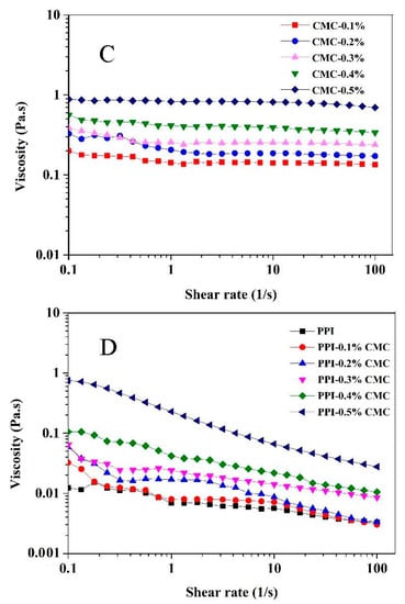 The changes of the viscosity with the shear rate of the individual CMC solution at pH 7.0 and pH 4.5 (A,C) and PPI-CMC mixed solutions at pH 7.0 and pH 4.5 (B,D).