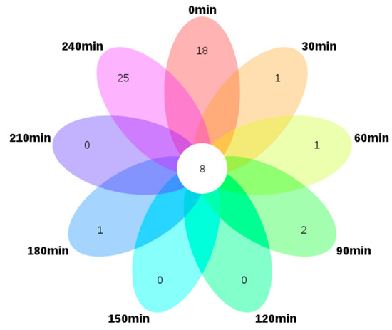 To visualize the relationship among the samples collected at various intervals (nine in total), a Venn plot was drawn based on the 111 identified volatile compounds. This showed the compositional variation of the volatile compounds with processing time. Interestingly, as shown in Figure 1, the nine samples only shared eight volatile compounds, namely dimethyl sulfide, 3-methyl-butanal, 2-octanone, nonanal, 2-ethyl-1-hexanol, dimethyl sulfoxide, 2,4-di-tert-butylphenol, and 2-pentyl-furan, indicating these compounds persisted throughout the dehydration process. Sample S-240 possesses the most unique volatile compounds, 25, followed by S-0 which has 18 unique species. Only one, one, two, and one unique constituent were detected in S-30, S-60, S-90, and S-180, i.e., eugenol, 3-hydroxy-2,2,4-trimethylpentyl 2-methyl-propanoate, 2-pentadecanone and nonanoic acid, and benzyl alcohol, respectively, whereas S-120, S-150 and S-210 shared all the constituents with the other interval samples.