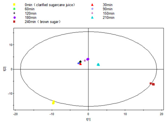 As an overview of the profile of volatile compounds during the entire dehydration process, the raw peak table was statistically analyzed using unsupervised PCA. The score plot clearly revealed stepwise alterations and distinct differences of volatile compounds from S-0 to S-240 (Figure 2). An obvious difference was observed between S-0 and S-30, and this could be due to the evaporation loss of some volatile aldehydes, alcohols etc., arising from the increased temperature. For example, aldehydes including 2,4-decadienal, 2,4-nonadienal, octanal and 3-methyl-butanal, and alcohols including1-octen-3-ol existed in fresh cane juice, whereas all these aldehyde contents experienced a significant drop from S-0 to S-30.