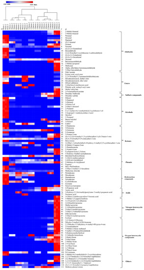 Dendrogram obtained from HCA (Hierarchical Cluster Analysis) of the 111 identified volatile compounds during the dehydration of sugarcane juice to NCS process. (The colour box for each compound indicates the abundance of the compound, the red colour annotates higher abundance while the blue colour annotates the lower abundance).