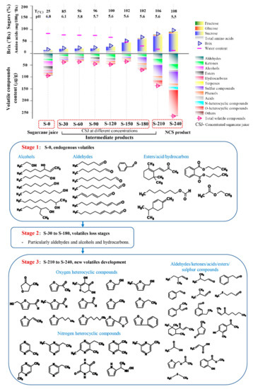 As observed from the overall compositional profiles of the intermediates during dehydration of membrane-clarified sugarcane juice (Figure 4), S-0 had a relatively high content of volatile compounds, among which aldehydes, alcohols, hydrocarbons, and esters are the four major components that form the typical aroma present in fresh cane juice. As shown in Figure 4 Stage1, aldehydes and alcohols present in sugarcane juice are mainly long chain fatty aldehydes and alcohols. Meanwhile, from S-30 to S-180 (Figure 4 Stage 2), there is a significant loss of these endogenous volatiles, which could be due to the evaporation caused by the increased temperature and vacuum applied to the system. The development of the aroma compounds present in NCS mainly occurred at the post dehydration stages from S-210 to S-240 (Figure 4 Stage 3), during which the temperature was 106–108 °C and pH was ~5.50. Aldehydes, ketones, oxygen heterocyclic compounds, typically furans, and nitrogen heterocyclic, typically pyrazines, were found to predominate, which are associated with both caramelization and Maillard reactions. Sugars are the dominate components in sugarcane juice, and represent a source for caramelization, while the chemistry underlying the Maillard reaction is a complex reaction between the carbonyl group of reducing sugars and amine group of free amino acid, peptides, and proteins [46]. A reasonable number of proteins and free amino acids (FAA) are present in juice which could provide reactants with sufficient basicity for the reaction to occur.