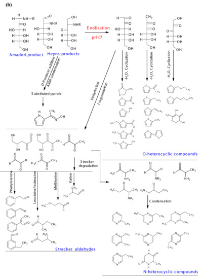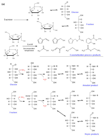(a) Sucrose chemical and thermal inversion process, the possible caramelization reaction pathway of mono sugars, and the initiation of mono sugars Maillard reaction pathways, and (b) the possible Maillard reaction pathways for the typical volatiles formed in the dehydration process.
