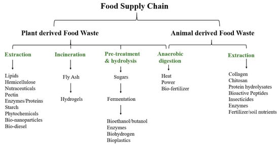 Another alternative presented nowadays for large volumes of produced wastes is the production of energy through the use of biomass or as animal feed (Figure 1). Nonetheless, the wastes are still rich in other valuable compounds such as pigments, sugars, organic acids, flavors, phytochemicals, enzymes, antimicrobial compounds, and fibers that could be extracted in order to use as food additive or supplement with higher added value [27]. Furthermore, the recovery of these BCs is a challenging and important task for their return to industrial chains (commercialization) applying the circular economy concept in order to be employed for the arising trends regarding human demand [3].