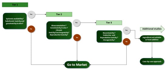To protect public health, when a novel food or ingredient is proposed is necessary to ensure consumer health, and for that safety assessments, procedures are proposed in regulations [94]. The toxicological evaluation is fundamental in all safety assessments, whatever the country and the laws that govern them. In EU countries, the toxicological evaluation should be followed by the EFSA guidelines. These guidelines were made to perform the safety assessment of the food additives, vitamins and minerals, novel foods, food supplements, and botanicals and follow the tier toxicity testing approach proposed for food additives in 2012 [95,96]. Whereas in the USA, the evaluation should be followed by FDA rules accordingly the Toxicological Principles for the Safety Assessment of Direct Food Additives and Color Additives Used in Food, commonly known as the Redbook [97]. In EU countries, the EFSA guidelines use a tiered approach, i.e., sequential testing strategy, where it is divided into three groups. The first group, tier 1 includes the minimal data required for all compounds. The following group is the tier 2 and is mandatory for compounds that are absorbed and exhibit in vitro toxicity or genotoxicity in the gastrointestinal system, i.e., compounds that test positive in tier 1 tests. Lastly, the tier 3, which should be accomplished if after tier 2 tests the compounds show bioaccumulation, in vivo genotoxicity, and chronic toxicity. In this tier, a case-by-case approach must be established considering all the available data [18,95]. So, all compounds must be analyzed for the minimum tests required (tier 1) and depending on the results they may need further testing (Figure 2). For example, in vitro positive results in genotoxicity testes (Tier 1) obligate a follow-up for in vivo genotoxicity tests (Tier 2). Moreover, the tiered approach, is designed to evaluate four core areas: toxicokinetics, genotoxicity, toxicity, and reproductive and developmental toxicity [18,95]. Accordingly the guidelines provided by EFSA [95], there are several general issues that should be considered in the design, conduct, and interpretation of toxicological studies for submission to approval, the most important are: (1) The studies should be performed with the additive according to the proposed specifications and should be produced according to the application; (2) studies with animals and humans should comply the EU standards and regulations for ethical approval and welfare standards; (3) studies in animals should follow the internationally agreed test guidelines (Directive 2010/63/EU [98]); (4) toxicokinetics and toxicity of food additives in animals should be conducted using internationally agreed test guidelines described in OECD test guidelines (OECD TG) or in Council Regulation (EC) No. 440/2008 [99]; (5) non-clinical studies should follow the principles of Good Laboratory Practice (GLP) described in Directive 2004/10/EC19 [100]; (6) the oral route should be selected for testing substances and the bioactive ingredients should be added to solid food, or to both solid and liquid, and normally via the diet. For substances applied in beverages, administration via drinking water may be the best option; (7) botanical food additives derived from conventional food sources with a long-term history of food use, may benefit from a “presumption of safety” when an adequate information exists.