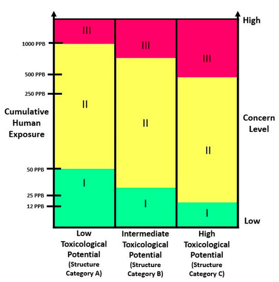 Regarding the guidelines that must be followed in the USA for food additives toxicological evaluation, the FDA first presumes that essential toxicological information is necessary for every food additive. After that, the safety data required are dictated by the concept of concern level (CL). Lastly, the CL is evaluated considering the additive potential human intake and its molecular structure. However, the initial estimation of testing requests can be changed if results suggest a substantial or unpredicted adverse effect. The total results of toxicology studies are then used to calculate the acceptable daily intake (ADI) which is then compared with the estimated daily intake (EDI) values; if the EDI is less than ADI, the food additive is safe under these conditions [106]. The concept of CL (low (I), intermediate (II) or high (III)) is fundamental to the toxicological safety evaluation for the additives and its identification is made based on the diagram represented in Figure 3. The level of expected toxicity of a compound is assigned based on its molecular structure (low (A), intermediate (B), or high (C)) and an estimation of cumulative human exposure [97]. Examples of category A compounds include fats, fatty acids, ketones, esters, monocyclic hydrocarbons, acids, and human metabolites of carbohydrates and lipids. Category B includes inorganic salts of iron, copper, zinc, amino acids, and proteins. Category C includes amides and imines, polycyclic aromatic hydrocarbons, compounds with nitro, N-nitroso, azide, and purine groups. Finally, based on the LOC obtained, there are a list of minimum toxicity studies that are required, to support the safety of the food additive (Table 3) for each of the CL (I, II, and III).