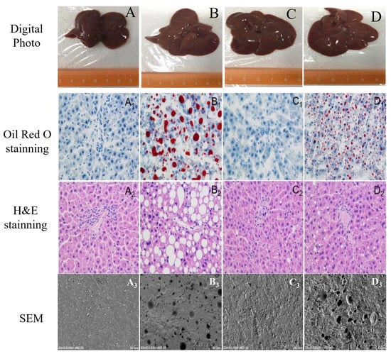 A portion of the liver was fixed in 4% paraformaldehyde solution. The fixed liver was embedded in paraffin, cut into slices (6 µm thick), and stained with H&E. For Oil Red O staining, a frozen liver sample was processed using a cryostat (CM1950, Leica, Munich, Germany) and stained. The stained areas were observed under an Olympus light microscope and photographed. The samples were fixed at room temperature with 4% formaldehyde (formaldehyde:water, V:V) for 40 h, followed by 20%, 30%, 50%, 70%, 75%, 85%, 95%, and 100% ethanol solution gradient dehydration (the dehydration time at each concentration was 18 min); samples were then freeze-dried for 16 h and vacuum gold-plated. The SEM observation was carried out.